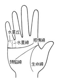 様々な様相の水星線……波状になっている水星線 図251を見てください。小指の下のふくらみ、つまり水星丘(点線で囲んである部分)に現れた水星線(短い縦の線・財運線とも呼ぶ)がくねくねと波状になっているでしょう? 水星線の長さは水星丘の範囲内に収まるものもあれば、図よりもっと長く、感情線より下から始まる水星線もあります。つまり、水星線がどんな長さであっても、くねくねと波状になっていればこのタイプですよ。結婚線と水星線の位置関係は、図250でもう一度確かめておきましょう。いつものように後天的な運勢を表す右手を中心に観察してくださいね。 図251のような波状の水星線を持つ人は、残念ながら金運が安定しません。仕事が順調にいかず、収入がアップダウンしやすいのです。安定した生活を強く願い、努力するといったこともあまりないタイプで、仕事もお金も風まかせという感じがありますよ。でも、そうした生活態度の自分を反省、そこから抜け出そうと努力を始めれば、波状の水星線が次第に目立たなくなり、線がしっかりしてくることはありますよ。 はい、今日はここまでね。明日は切れ切れになっている水星線についてお話ししましょう。 |