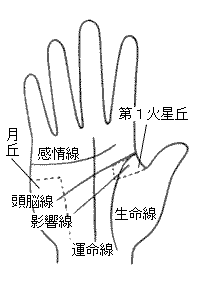 様々な様相の影響線……運命線の一歩手前で終わっている影響線 図282を見てください。月丘側から運命線に向かって伸びた影響線が運命線には結びつかず、その一歩手前で終わっているでしょう? 影響線の長さや現れている位置は人それぞれですし、運命線の長さや様相も人によって違いますから、あまり気にしないでくださいね。このような影響線があるかどうかだけを探してみましょう。いつものように後天的な運勢を表す右手を中心に観てください。でも、右手に影響線がなかったら、先天的な運勢を表す左手も観察しましょう。実は、影響線は左右両手に出ている場合と、どちらか片方に出ている場合があり、それによって、ちょっと意味が異なるからなのです。その違いは「第265回講座」でお話ししてありますよ。 図282のような影響線は、愛情面のみを表すと考えて良いでしょう。つまり仕事を意味しているということはまずない影響線です。恋愛に何らかの事情や反対、妨害などが入りやすく、結婚には至らずに別れる可能性が高いのです。そうした悲しみが起こる年齢は、「運命線の流年法・図175」にあてはめて推測することができます。ちなみに図282の場合は、24、5歳頃と判断できます。 ただ、このような影響線が出ていても「自分は恋愛や結婚運が悪い」と決めつけて、悲観しないでいいのですよ。こういう人はほとんどの場合、そうした辛い恋愛を一度体験すれば、その後、恋愛運が上昇。恋愛から結婚へとスムーズに進展するケースが多いのです。 はい、今日はここまでね。明日は運命線を通り抜けて第1火星丘にまで伸びている影響線についてお話ししましょう。 |