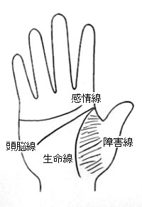様々な様相の障害線……弧を描いて生命線を横切る障害線 図296を見てください。弧を描くような感じの短い障害線が生命線を横切っているでしょう? この障害線の長さはちょっと微妙なのですが、だいたい1センチ以内と考えてください。必ず上がふくらんだような弧を描いていますよ。生命線のどのあたりを横切っているかは、人によって違います。この障害線は生命線より細い線ですが、くっきりと濃い場合と薄い場合があります。生命線の長さや様相は、この際、こだわらないようにしましょう。いつものように後天的な運勢を表す右手を中心に観てくださいね。 図296のような障害線は、突然の災難や事故、急病を意味しています。障害線が生命線よりずっと薄ければ、災難や事故、あるいは急病に罹ったとしても、あまり心配は入りませんよ。すぐに回復するていどのものです。ただし、生命線と同じくらいの濃さか、むしろ生命線より濃い感じがする障害線の場合は、生命にかかわることがありますから、注意が必要です。なお、そのような不幸が襲う年齢は「第121回講座生命線のヒミツ(その2)生命線の流年法」に当てはめて推測できます。ちなみに、図296の場合は40歳頃と考えてよいでしょう。 でも、何度もお話ししていますが、手相に現れる悪い印は、天からの親切な警告です。体に気をつけ、車の運転やその他のことでもじゅうぶんに注意していれば、大難を小難におさえることもできますよ。そして、それとともに、障害線が薄くなってくる可能性もあるのです。 はい、今日はここまでね。明日は、金星丘から出発する障害線が、第2火星丘に達している場合についてお話ししましょう。 |
