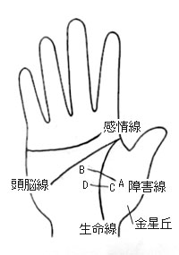 様々な様相の障害線……金星丘から出発して、生命線を横切る障害線 図295を見てください。金星丘から出発した障害線が、生命線を横切っているでしょう? この障害線は細くて薄い線である場合が多いですよ。障害線の長さは人それぞれで、ABくらいの長めのものや、CDくらいの短めのものなど、いろいろです。でも、ごく短い障害線は、このタイプではなく、ずっと以前に「第157回講座生命線のヒミツ(その38)」で、生命線を横切るごく短い線としてお話ししましたので、再確認しておいてくださいね。また、生命線の長さや様相は、この際、こだわらないようにしましょう。生命線のどこかに、図295のような障害線が現れていないかどうかだけを探しましょう。いつものように後天的な運勢を表す右手を中心に観てくださいね。 図295のような障害線を持つ人は、何か大きな悩み事や心配事が生じる恐れがあります。そして、その原因はほとんどの場合、家族や親戚など、身内に関する問題です。障害線が濃く深く刻まれているほど、心配や悩みも深いのです。また、このような障害線が何本もある人は、性格的に取り越し苦労をしやすいと言えますね。なお、悩みや心配事が生じる年齢は、「第121回講座生命線のヒミツ(その2)生命線の流年法」に当てはめて推測できます。ちなみに、図295の場合は、ABがだいたい30歳頃、CDが40歳頃と考えてよいでしょう。 でも、このような障害線があったからといって、それほど恐れる必要はありませんよ。決して乗り越えられないほどの大問題ではないのです。もし、何か起きたら、冷静に判断し、行動すれば大丈夫ですよ。 はい、今日はここまでね。明日は、弧を描いて生命線を横切る障害線についてお話ししましょう。 |